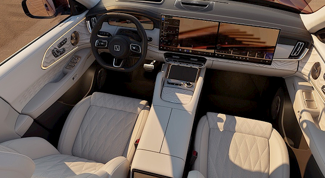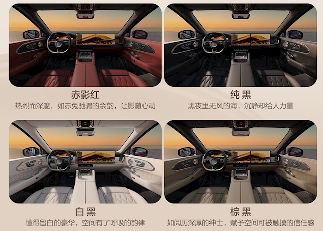 从官图看,8X的内饰方案和9X有延续性,提供四种配色,配备全液晶仪表盘,还使用中空+副驾一体屏,并配有AR-HUD抬头显示。